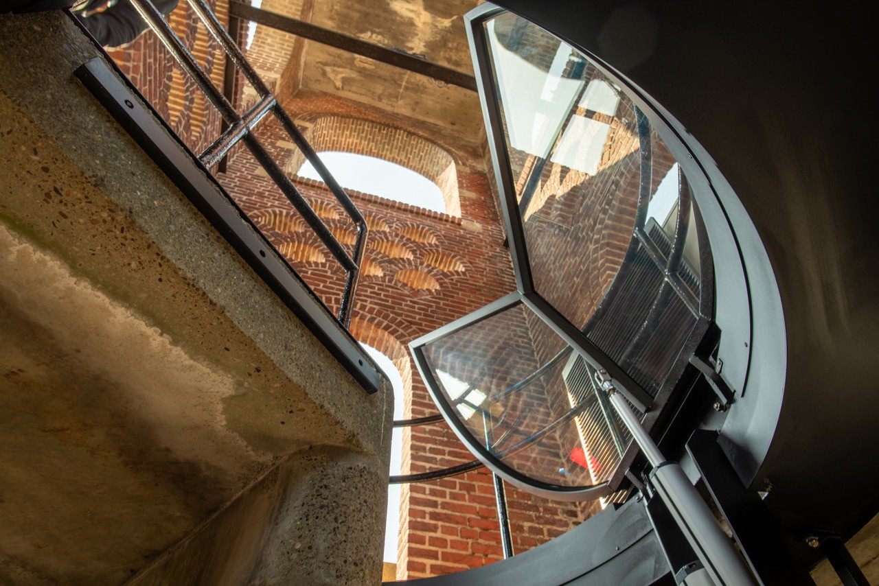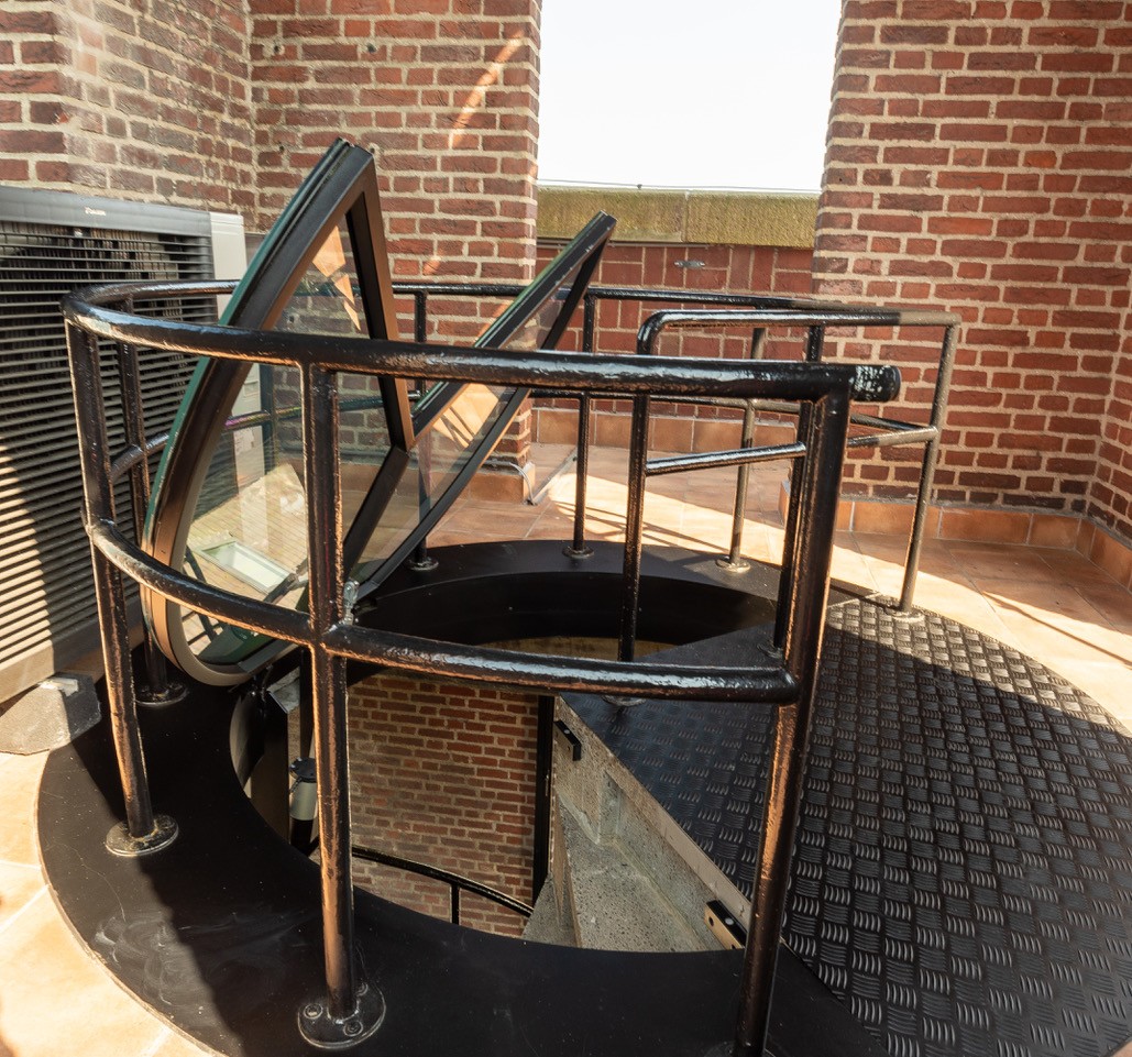 In opdracht van Schonck, Schul & Compagnie hebben we een een bijzonder vloerluik in Breda mogen ontwerpen en plaatsen in één van de torens van ‘De Klokkenberg’: een rijksmonument dat een uniek onderdeel uitmaakt van de Nederlandse geschiedenis. Om het vloerluik passend te maken hebben we een pacman-model (3/4 rond) aangehouden. Hiermee wordt de open trapdoorgang naar één van de torens volledig afgesloten. De enige manier om het vloerluik te plaatsen was met een grote kraan. Het kostte wat moeite, maar wel met een geweldig een resultaat!